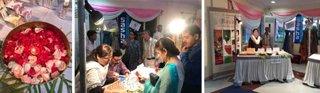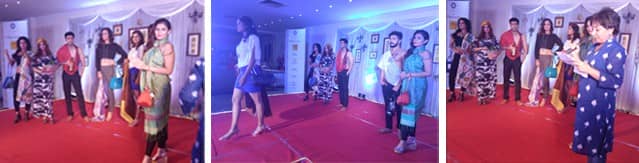 Later, on the 21st July evening, at 8 P.M, Sasha participated in a designer fashion pageant by eminent T2 Telegraph – ramp models, choreographed by Prithviraj Ghosh of ‘Exposure’. Ours was the last showstopper sequence, among a series of other designers and jewellers of the city, where the 5 female and 2 male models, showcased our silk stoles, ceramic and dhokra jewellery, carrying our handbags and handicrafts, with the backdrop of lilting music. Karobi Chowdhury, a senior Sasha employee read out our detailed history and initiatives that lead to the beautiful products on display. What set Sasha apart from the rest of the participants, over and above that our sequence was last and the showstopper round, also that the models unlike in the previous sequences wore trendy western wear that highlighted our products rather well, was that the ramp’s backdrop was totally decorated with some of our best dhokra and other handicrafts, bearing placards with the Sasha logo and 40 years artwork. The event almost seemed like an out and out Sasha event. We also had a display and sales stall/table at the further end of the ramp in the hall, where we displayed our entire RASA line of skin care and distributed our product catalogue leaflets.