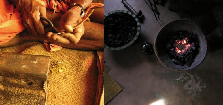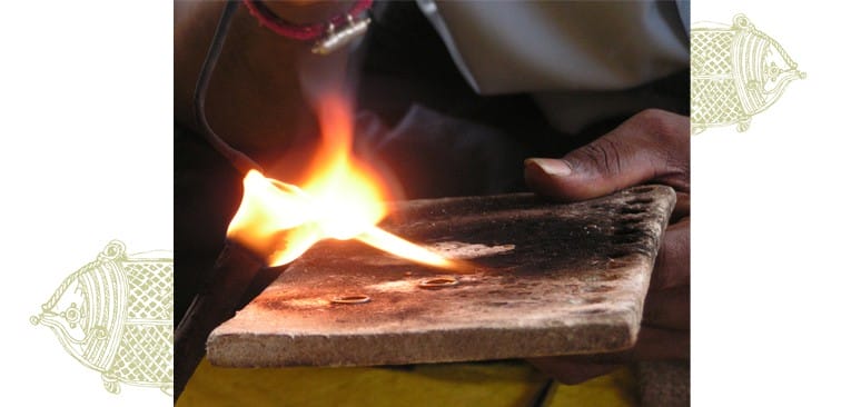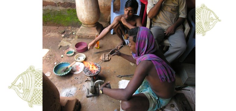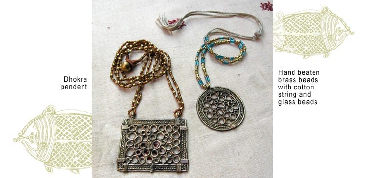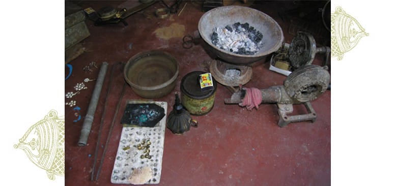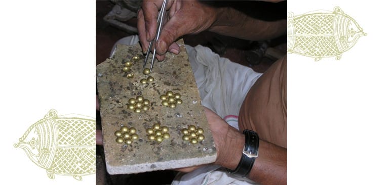 Jewelry making is an ancient craft in Orissa and very little has changed in the tools and techniques they use. The craftspeople here are versatile and work with precious and non-precious metals with equal ease. Design innovations have introduced new elements like colored cotton thread and glass beads from Benaras (Varanasi).