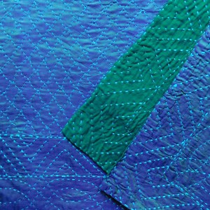 The Sanskrit word kontha means ‘rags’. One legend links their origins to Lord Buddha and his disciples, who used to cover themselves with garments made from discarded rags that were patched and sewn together. Rags displayed at Indian shrines or tied to tree limbs symbolize prayers and wards off the evil eye. The oldest existing examples of kantha, date from the early 1800s. They are embroidered with blue, black and red threads that were unraveled from sari borders. Because they were salvaged from used garments that had been frequently laundered, the colors tend to be muted.