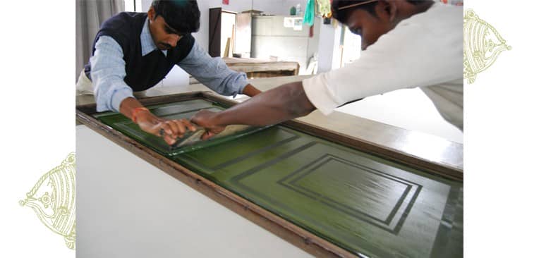 This technique is the most common form of textile printing and it involves the application of the printing paste through a fine screen placed in contact with the fabric to be printed. Screens are made by tightly stretching a fine mesh fabric across a metal frame. The design is created in reverse by blocking areas of the screen where no color is to be printed – a separate screen is used for each color.