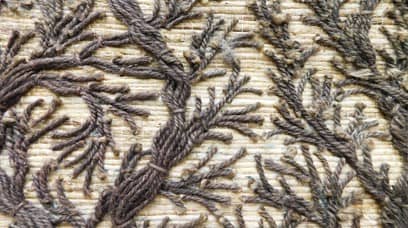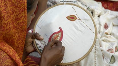 This is fine embroidery of Mogul origin, on a frame using an aari or awl, uses zari, sequins or beads. The artisans have a very fine eye for detail can make even a small flower come alive with their stitches.