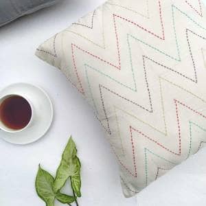 Kantha stitching regarded for its craftsmanship, beauty and art is reflected on this white cushion cover. Kantha embroidery is an indigenous household craft that is now an art form and its ability to tell a story.