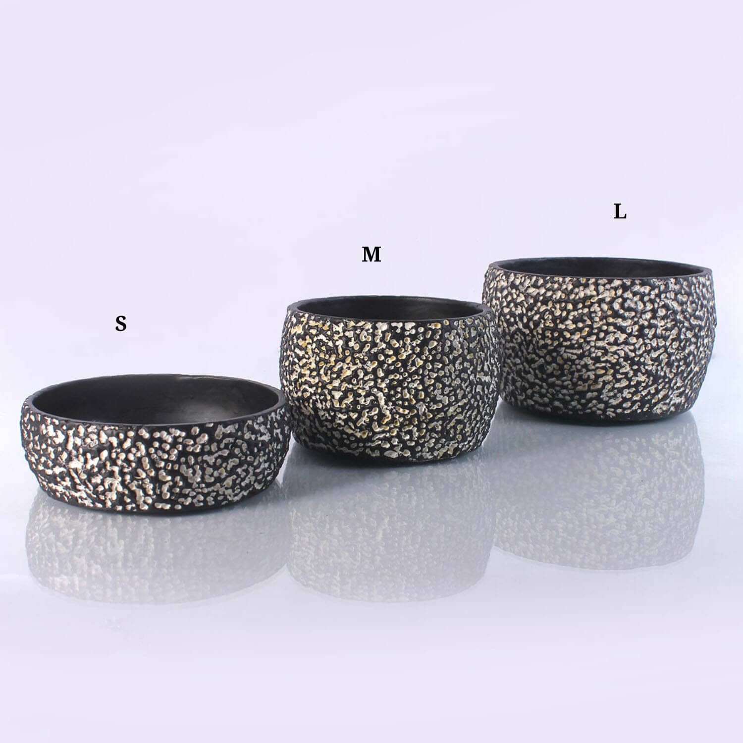 Vyeth (River Jhelum in Kashmiri) – is a set of three bowls inspired by art deco style with surface surface decoration using carving lines into moulds at various depths. Black and White combination gives them a stark and elegant look, to fit into any kind of decor- home, office or gardens. Ideal as gifts, elegant tableware to hold dried tit bits or on the workstation.